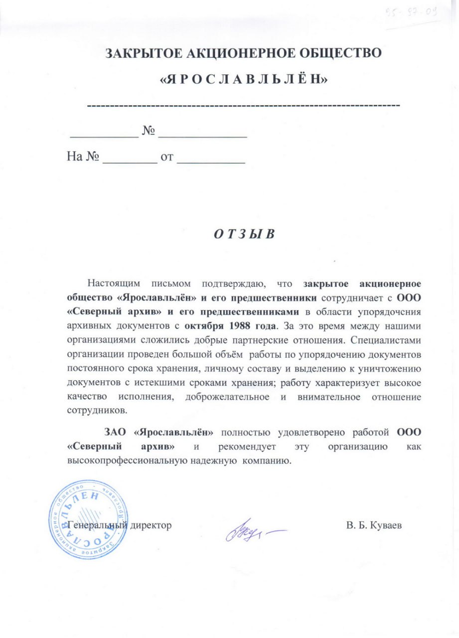 Отзыв от закрытого акционерского общества ЗАО "Ярославльлён"