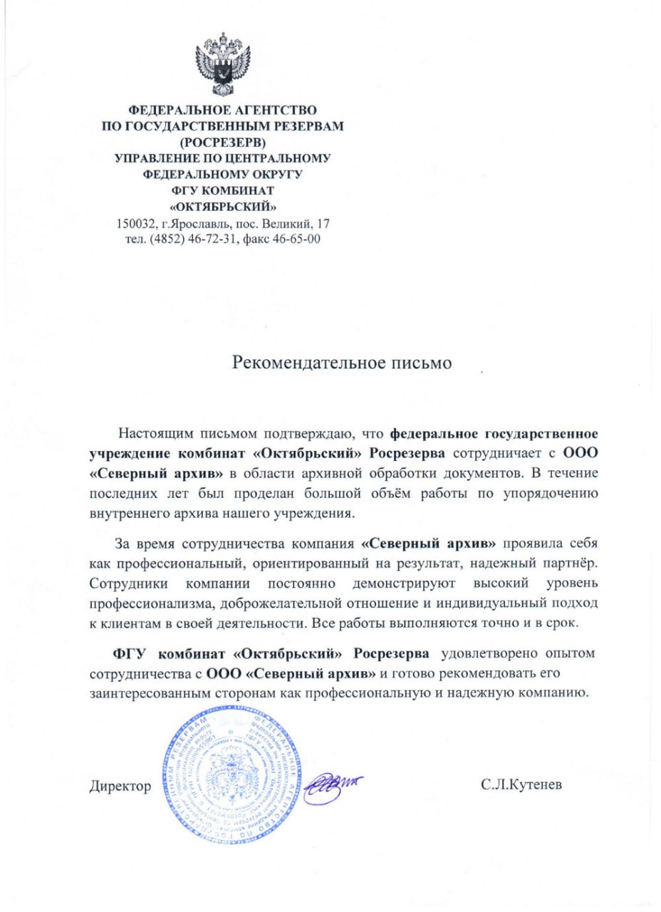 Рекомендательное письмо выданное ФГУ комбинатом «Октябрьский» (учреждение Федерального агентства по государственным резервам — Росрезерв)