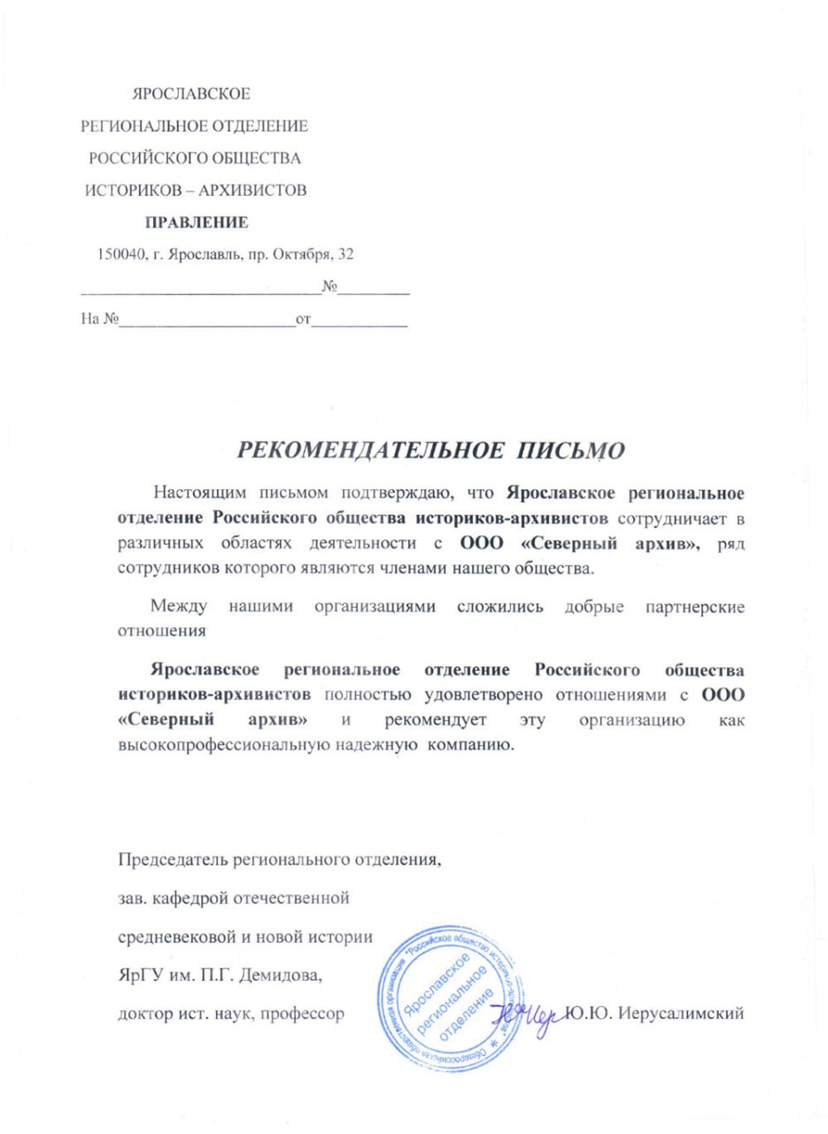 Ярославское региональное отделение Российского общества историков-архивистов. Организация рекомендует «Северный архив» как высокопрофессиональную и надёжную компанию.