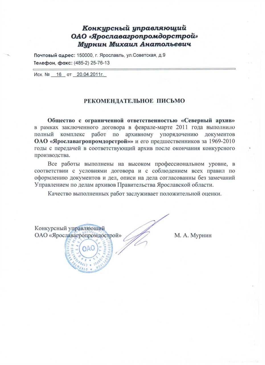 Конкурсный управляющий ОАО «Ярославгазпромдорстрой». В 2011 году «Северный архив» выполнил полный комплекс работ по архивному упорядочению документов за 1969–2010 гг.