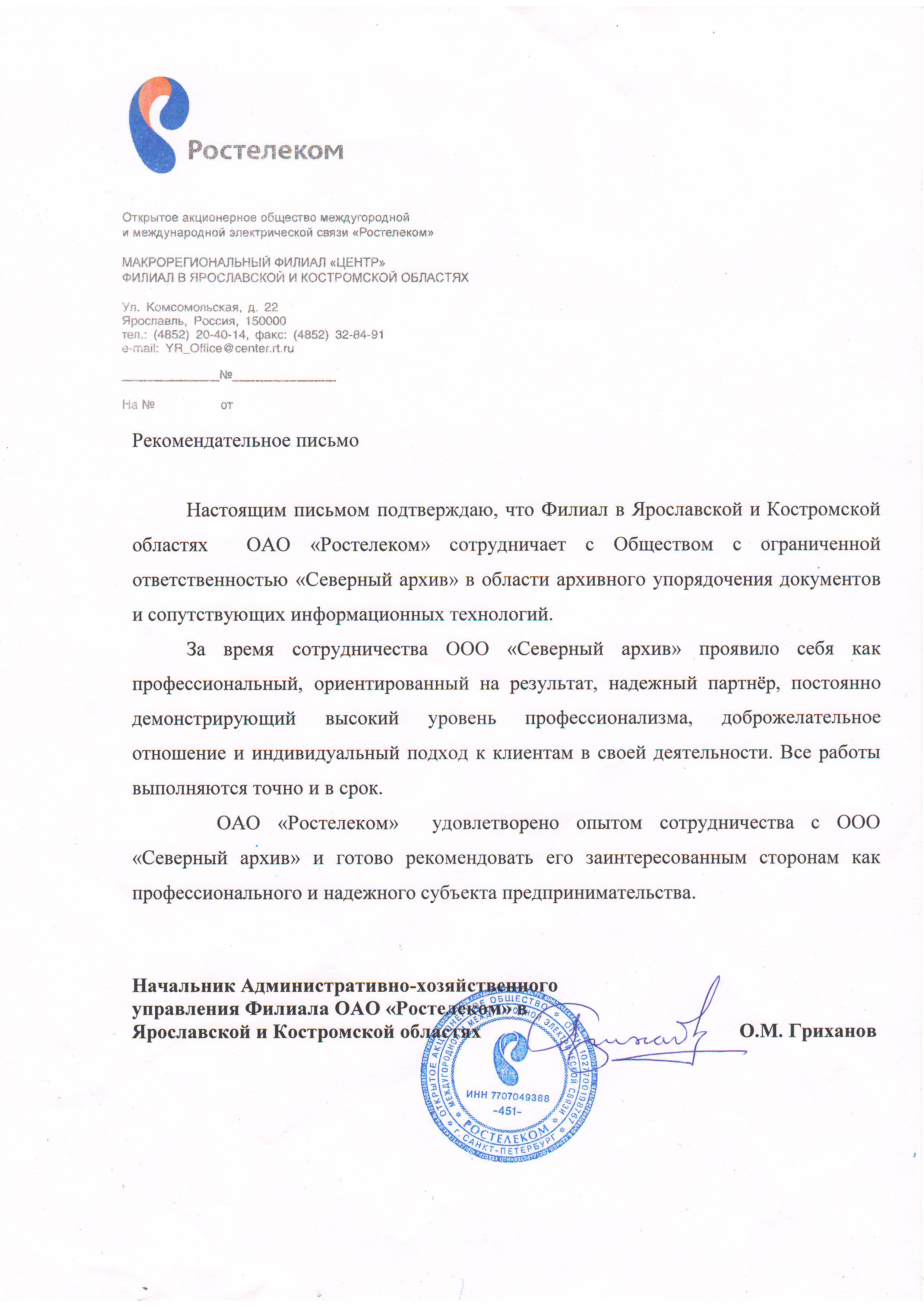 Филиал ОАО «Ростелеком» в Ярославской и Костромской областях. Подтверждается сотрудничество в области архивного упорядочения документов и IT-услуг.